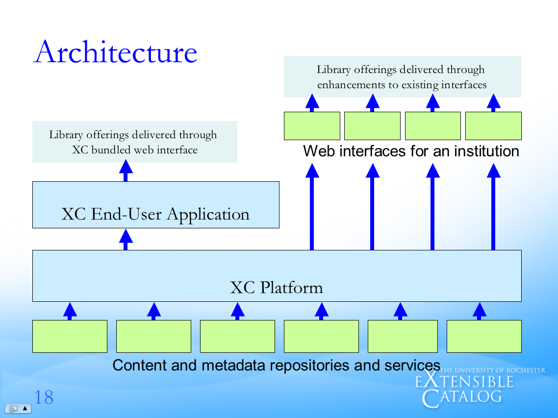 The last layer is a set of Web Services interfaces to the Platform allowing libraries to syndicate and incorporate XC (think, "library") content into things like a website, a content management system, a campus-wide portal, or a course management system. In today's world it is not about getting people to come to your website. Rather, it is about putting your content in their context and their websites. The Web Services interface satisfies this need.